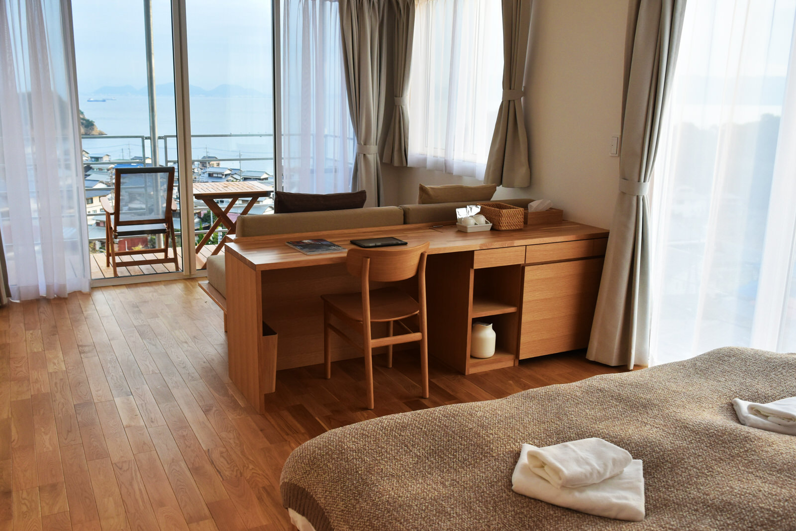 The large open terrace faces the south of the Island overlooking the peaceful Seto Inland Sea and the mountains of Shikoku. The window faces west allowing you to see Naoshima’s Miyaura Port. You can see the Sea from the bathroom window. The large sofa bed can accommodate up to 3 people. Our deluxe room truely is a unique experience.